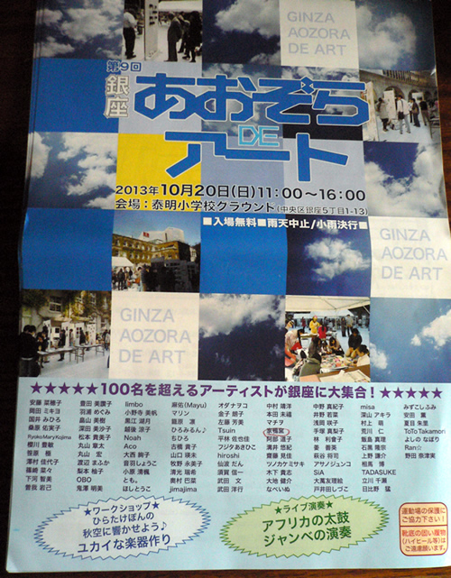 「銀座あおぞらDEアート」は銀座を拠点にしているギャラリーが、毎年発表を続ける魅力的な若手作家を紹介する展覧会です。画廊が集っている銀座と言う地を活かして屋外展示の気軽さから、より多くの人にアートをもっと身近に楽しんでもらえるように、展示内容や様々なワークショップを企画しています。2005年より毎年開催し、多くの企業協賛を頂き、今年で第9回を迎えます。