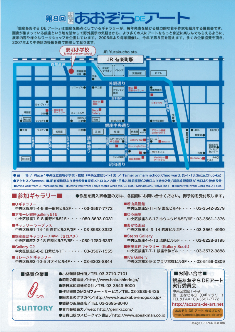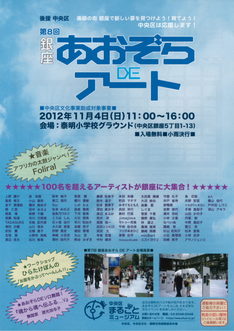 とうとう、明日に迫りました! ▼2012/11/4(日) 11~16時 (小雨決行) 銀座あおぞらDEアート @中央区立泰明小学校 (中央区銀座5-1-13) 追記)泰明小学校の運動場の保護のため 「靴底の固い履物(ハイヒール等)はご遠慮願います。」とのこ 宜しくお願いいたします。 『銀座を拠点にしているギャラリーが毎年発表を続ける魅力的な若手作家を紹介する展覧会』 つまり、ギャラリーで発表されている100名を超える作家さん方とご一緒に出展です! ドキドキも相当ですが、ワクワク度合いも相当です!(笑 |